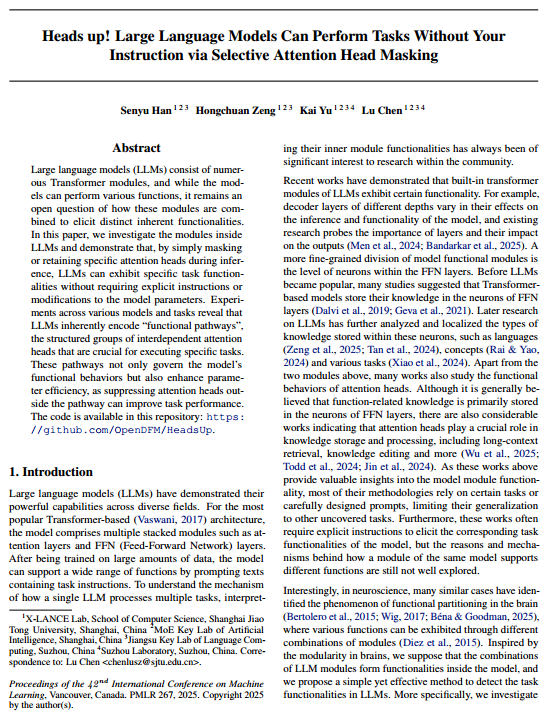 1 安装 1.1 虚拟环境 1 2 3 4 5 6 7 8 9 conda create -n heads python=3.10 -y conda activate heads pip install ipykernel seaborn adjustText pip install rouge_score nltk jieba pip install torch transformers==4.51.3 datasets==3.0.1 safetensors accelerate flash_attn-2.7.3+cu12torch2.4cxx11abiFALSE-cp310-cp310-linux_x86_64.whl python -m ipykernel install --user --name heads jupyter kernelspec list