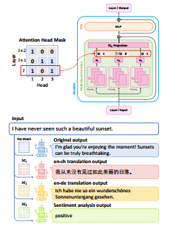 1 2 3 4 5 6 7 8 9 10 11 12 13 14 15 16 17 18 19 20 21 22 23 def translate (input_str, src_lang="en" , tgt_lang="zh" ): mask_weight = (weight_dict[f"{src_lang} _{tgt_lang} " ].sigmoid() >= 0.5 ).float ().numpy().clip(min =0.0 ) print (mask_weight.sum ()) with torch.no_grad(): lm_inputs_src = tokenizer([LLAMA_TEMPLATE.format (src=input_str)+"" ], add_special_tokens=False , return_tensors="pt" ).to(DEVICE) generate_ids = model.generate(**lm_inputs_src, max_new_tokens=50 , weight_tensor=None , do_sample=False ) pred_str = tokenizer.decode(generate_ids[0 ][lm_inputs_src.input_ids.size(1 ):], skip_special_tokens=True ) print ("[ORIGINAL]" , pred_str) mask_tensor = torch.tensor(mask_weight).unsqueeze(0 ).repeat(1 , 1 ).to(model.device) generate_ids = model.generate(**lm_inputs_src, max_new_tokens=50 , weight_tensor=mask_tensor, do_sample=False ) pred_str = tokenizer.decode(generate_ids[0 ][lm_inputs_src.input_ids.size(1 ):], skip_special_tokens=True ) print (f"[{tgt_lang} ]" , pred_str) random_tensor = torch.tensor(mask_weight)[torch.randperm(len (mask_weight))].unsqueeze(0 ).repeat(1 , 1 ).to(model.device) generate_ids = model.generate(**lm_inputs_src, max_new_tokens=50 , weight_tensor=random_tensor, do_sample=False ) pred_str = tokenizer.decode(generate_ids[0 ][lm_inputs_src.input_ids.size(1 ):], skip_special_tokens=True ) print ("[RANDOM]" , pred_str) translate("I have never seen such a beautiful sunset." ) translate("This is expected as the model has lost the majority of its attention heads.\n\nTranslate into Chinese:" )
