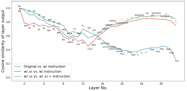 1 2 3 4 5 6 7 8 9 10 11 12 13 14 15 16 17 18 19 20 21 22 23 24 25 26 27 28 29 30 31 32 33 34 35 36 37 38 39 40 41 42 43 44 45 46 47 48 49 50 51 52 53 54 55 56 57 58 59 60 61 62 63 64 65 with torch.no_grad(): lm_inputs_src_inst = tokenizer([LLAMA_TEMPLATE.format (src=input_str_inst)+target_str], add_special_tokens=False , return_tensors="pt" ).to(DEVICE) lm_inputs_src = tokenizer([LLAMA_TEMPLATE.format (src=input_str)+target_str], add_special_tokens=False , return_tensors="pt" ).to(DEVICE) mask_tensor = torch.tensor((weight_dict["en_zh" ].sigmoid() >= 0.5 ).float ().numpy()).unsqueeze(0 ).repeat(1 , 1 ).to(model.device) original_output = model(**lm_inputs_src, output_hidden_states=True , output_attentions=True ) layer_outputs = torch.stack(original_output.hidden_states) layer_token_logits = model.lm_head(layer_outputs) layer_pred_tokens = tokenizer.batch_decode(layer_token_logits[:, 0 , -15 ].argmax(-1 )) original_inst_output = model(**lm_inputs_src_inst, output_hidden_states=True , output_attentions=True ) inst_layer_outputs = torch.stack(original_inst_output.hidden_states) inst_layer_token_logits = model.lm_head(inst_layer_outputs) inst_layer_pred_tokens = tokenizer.batch_decode(inst_layer_token_logits[:, 0 , -15 ].argmax(-1 )) weighted_output = model(**lm_inputs_src, weight_tensor=mask_tensor, output_hidden_states=True , output_attentions=True ) weighted_layer_outputs = torch.stack(weighted_output.hidden_states) weighted_layer_token_logits = model.lm_head(weighted_layer_outputs) weighted_layer_pred_tokens = tokenizer.batch_decode(weighted_layer_token_logits[:, 0 , -15 ].argmax(-1 )) weighted_inst_output = model(**lm_inputs_src_inst, weight_tensor=mask_tensor, output_hidden_states=True , output_attentions=True ) weighted_inst_layer_outputs = torch.stack(weighted_inst_output.hidden_states) weighted_inst_layer_token_logits = model.lm_head(weighted_inst_layer_outputs) weighted_inst_layer_pred_tokens = tokenizer.batch_decode(weighted_inst_layer_token_logits[:, 0 , -15 ].argmax(-1 )) cosine_sim1 = torch.cosine_similarity((inst_layer_outputs[:, 0 , -15 :-14 ].mean(dim=-2 )), (weighted_layer_outputs[:, 0 , -15 :-14 ].mean(dim=-2 ))).float ().cpu().numpy() cosine_sim2 = torch.cosine_similarity((inst_layer_outputs[:, 0 , -15 :-14 ].mean(dim=-2 )), (layer_outputs[:, 0 , -15 :-14 ].mean(dim=-2 ))).float ().cpu().numpy() cosine_sim3 = torch.cosine_similarity((weighted_layer_outputs[:, 0 , -15 :-14 ].mean(dim=-2 )), (weighted_inst_layer_outputs[:, 0 , -15 :-14 ].mean(dim=-2 ))).float ().cpu().numpy() print ("Similarity between w/ mask vs. w/ instruction\n" , cosine_sim1) print ("Similarity between Original vs. w/ instruction\n" , cosine_sim2) print ("Similarity between w/ mask vs. w/ mask + instruction\n" , cosine_sim3) (b1, _, b2), (r1, _, r2), (g1, _, g2) = sns.color_palette("Blues" , 3 ), sns.color_palette("Reds" , 3 ), sns.color_palette("Greens" , 3 ) plt.figure(figsize=(12 , 6 )) plt.xlabel("Layer No." , fontsize=18 ) plt.xticks(np.arange(1 , 32 , 4 ), labels=np.arange(0 , 32 , 4 ), fontsize=12 ) plt.xticks(np.arange(33 ), minor=True ) plt.ylabel("Cosine similarity of layer output" , fontsize=18 ) plt.yticks(fontsize=12 ) plt.plot(cosine_sim2, label="Original vs. w/ instruction" , c=b2) plt.plot(cosine_sim1, label=r"w/ $\mathcal{M}$ vs. w/ instruction" , c=r2) plt.plot(cosine_sim3, label=r"w/ $\mathcal{M}$ vs. w/ $\mathcal{M}$ + instruction" , c=g2) texts = []for i, (xi, yi1, yi2, yi3) in enumerate (zip (np.arange(33 ), cosine_sim1, cosine_sim2, cosine_sim3)): texts.append(plt.text(xi, yi1-0.05 if xi<16 else yi1+0.05 , weighted_layer_pred_tokens[i], fontsize=9 , ha="center" )) texts.append(plt.text(xi, yi2+0.05 if xi<16 else yi2-0.05 , layer_pred_tokens[i], fontsize=9 , ha="center" )) adjust_text(texts, avoid_self=False ) for (t1, t2), xi, yi1, yi2 in zip ([(texts[i], texts[i+1 ]) for i in range (0 , len (texts), 2 )], np.arange(33 ), cosine_sim1, cosine_sim2): x_text, y_text = t1.get_position() plt.plot([xi, x_text], [yi1, y_text+0.02 if xi<16 else yi1+0.04 ], color=r2, linestyle="-" , linewidth=0.5 ) x_text, y_text = t2.get_position() plt.plot([xi, x_text], [yi2, y_text-0.02 if xi<16 else yi2-0.02 ], color=b2, linestyle="-" , linewidth=0.5 ) plt.ylim(-0.05 , 1.1 ) plt.legend(fontsize=15 ) plt.tight_layout() plt.show()