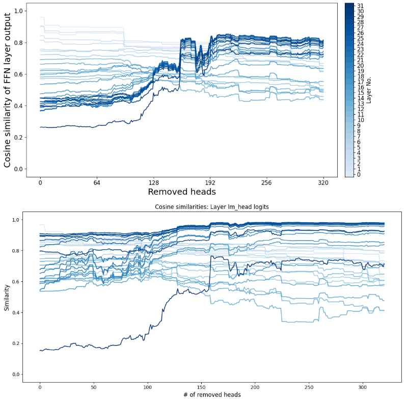 1 2 3 4 5 6 7 8 9 10 11 12 13 14 15 16 17 18 19 20 21 22 23 24 25 26 27 28 29 30 31 32 33 34 35 36 37 38 39 40 41 42 43 44 45 46 47 48 49 50 51 52 53 54 55 56 57 58 59 60 61 62 63 64 65 66 67 68 69 70 71 72 73 74 75 76 77 78 79 80 81 with torch.no_grad(): lm_inputs_src_inst = tokenizer([LLAMA_TEMPLATE.format (src=input_str_inst)], add_special_tokens=False , return_tensors="pt" ).to(DEVICE) lm_inputs_src = tokenizer([LLAMA_TEMPLATE.format (src=input_str)], add_special_tokens=False , return_tensors="pt" ).to(DEVICE) original_output = model(**lm_inputs_src_inst, output_hidden_states=True , output_attentions=True ) original_layer_outputs = torch.stack(original_output.hidden_states) original_layer_token_logits = model.lm_head(original_layer_outputs[:, 0 , -1 ]).float ().cpu() mask_weight = weight_dict["en_zh" ].sigmoid().numpy() mask_weight[32 ::33 ] = 0 order = mask_weight.argsort()[32 :] full_weight = np.ones_like(weight_dict["en_zh" ].sigmoid().numpy()) test_tensor = torch.tensor(full_weight).unsqueeze(0 ).repeat(1 , 1 ).to(model.device) weighted_outputs, weighted_logits = [], [] test_order = order[:320 ]with torch.no_grad(): weighted_output = model(**lm_inputs_src, weight_tensor=test_tensor, output_hidden_states=True , output_attentions=True ) weighted_layer_outputs = torch.stack(weighted_output.hidden_states) weighted_layer_token_logits = model.lm_head(weighted_layer_outputs[:, 0 , -1 ]) weighted_outputs.append(weighted_layer_outputs[:, 0 , -1 ].float ().cpu()) weighted_logits.append(weighted_layer_token_logits.float ().cpu()) for head_idx in tqdm(test_order): test_tensor[0 , head_idx] = 0 with torch.no_grad(): weighted_output = model(**lm_inputs_src, weight_tensor=test_tensor, output_hidden_states=True , output_attentions=True ) weighted_layer_outputs = torch.stack(weighted_output.hidden_states) weighted_layer_token_logits = model.lm_head(weighted_layer_outputs[:, 0 , -1 ]) weighted_outputs.append(weighted_layer_outputs[:, 0 , -1 ].float ().cpu()) weighted_logits.append(weighted_layer_token_logits.float ().cpu()) weighted_outputs = torch.stack(weighted_outputs) weighted_logits = torch.stack(weighted_logits) layers = np.arange(32 ) colors = sns.color_palette("Blues" , n_colors=36 )[-32 :] plt.figure(figsize=(12 , 6 )) plt.xlabel("Removed heads" , fontsize=18 ) plt.xticks(np.arange(0 , 1025 , 64 ), labels=np.arange(0 , 1025 , 64 ), fontsize=12 ) plt.ylabel("Cosine similarity of FFN layer output" , fontsize=18 ) plt.yticks(fontsize=12 ) plt.ylim(-0.05 , 1.05 ) layer_cosine_sim = [torch.cosine_similarity(original_layer_outputs[l+1 , 0 , -1 ].squeeze(0 ).float ().cpu(), weighted_outputs[:, l+1 ]).float ().cpu().numpy() for l in range (len (layers))]for l in layers: plt.plot(layer_cosine_sim[l], c=colors[l], label=f"Layer {l} " ) norm = mpl.colors.Normalize(vmin=0 , vmax=32 ) sm = mpl.cm.ScalarMappable(cmap=mpl.colors.ListedColormap(colors), norm=norm) sm.set_array([]) cbar = plt.colorbar(sm, ax=plt.gca(), orientation="vertical" , pad=0.02 ) cbar.set_label("Layer No." , fontsize=12 ) cbar.set_ticks(np.arange(0 , 32 )+0.5 ) cbar.set_ticklabels(np.arange(0 , 32 ), fontsize=12 ) cbar.ax.tick_params(labelsize=12 ) plt.tight_layout() plt.show() plt.figure(figsize=(12 , 6 )) plt.xlabel("# of removed heads" , fontsize=12 ) plt.ylabel("Similarity" , fontsize=12 )for l in layers: plt.plot(torch.cosine_similarity(original_layer_token_logits[l+1 ].squeeze(0 ).float ().cpu(), weighted_logits[:, l+1 ]).float ().cpu().numpy(), c=colors[l], label=f"Layer {l} " ) plt.ylim(-0.05 , 1.05 ) plt.title("Cosine similarities: Layer lm_head logits" ) plt.tight_layout() plt.show()