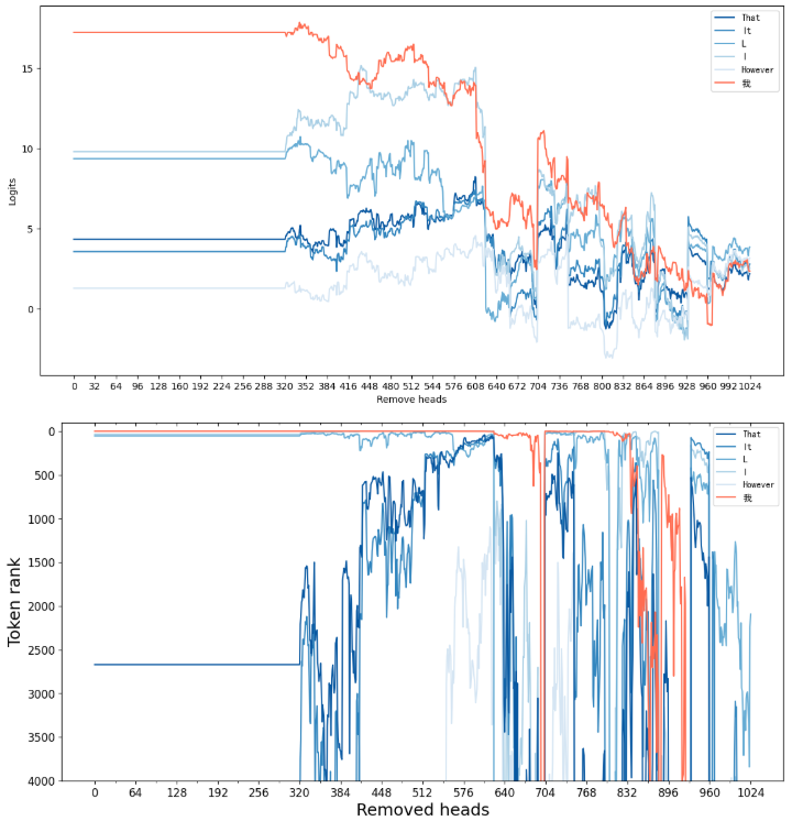1 2 3 4 5 6 7 8 9 10 11 12 13 14 15 16 17 18 19 20 21 22 23 24 25 26 27 28 29 30 31 32 33 34 35 36 37 38 39 colors = sns.color_palette("Blues" , 5 )[::-1 ] red = sns.color_palette("Reds" , 1 )[-1 ] fig, ax = plt.subplots(figsize=(14 , 7 ))for i in range (6 ): if i < 5 : ax.plot(pred_logits[:, i], label=topk_tokens[i], color=colors[i]) else : ax.plot(pred_logits[:, i], label="我" , color=red) ax.set_xlabel("Remove heads" ) ax.set_ylabel("Logits" ) ax.set_xticks(range (0 , 1025 , 32 )) plt.legend() plt.show() fig, ax = plt.subplots(figsize=(14 , 7 ))for i in [4 ,3 ,2 ,1 ,0 ,5 ]: if i < 5 : ax.plot(pred_rank[:, i], label=topk_tokens[i], color=colors[i]) else : ax.plot(pred_rank[:, i], label="我" , color=red) ax.set_xlabel("Removed heads" , fontsize=18 ) ax.set_ylabel("Token rank" , fontsize=18 ) ax.set_xticks(np.arange(0 , 1025 , 64 ), labels=np.arange(0 , 1025 , 64 ), fontsize=12 ) ax.set_xticks(np.arange(32 , 1025 , 64 ), minor=True ) ax.set_yticks(np.arange(0 , 4001 , 500 ), labels=np.arange(0 , 4001 , 500 ), fontsize=12 ) ax.set_ylim(-100 , 4000 ) top_ax = ax.twiny() top_ax.set_xlim(ax.get_xlim()) top_ax.xaxis.tick_top() top_ax.tick_params(direction="in" , which="both" ) top_ax.set_xticks(np.arange(0 , 1025 , 64 ), labels=[]) top_ax.set_xticks(np.arange(32 , 1025 , 64 ), minor=True ) plt.gca().invert_yaxis() plt.legend([ax.lines[i] for i in [4 ,3 ,2 ,1 ,0 ,5 ]], [topk_tokens[i] for i in range (5 )] + ["我" ], fontsize=12 ) plt.show()