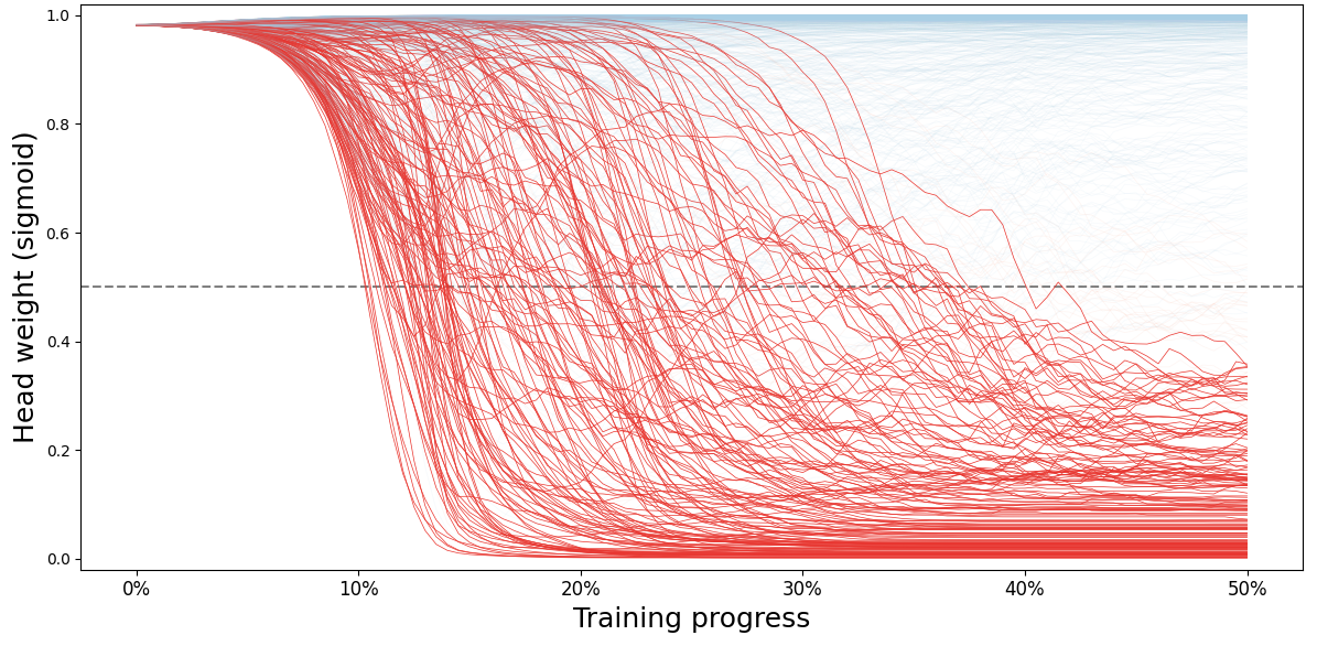 1 2 3 4 5 6 7 8 9 10 11 12 13 14 15 16 17 18 19 20 21 (b1, b2), (r1, r2) = sns.color_palette("Blues" , 2 ), sns.color_palette("Reds" , 2 ) step_weight_array = torch.stack([t.view(32 , 33 )[:, :-1 ].flatten().sigmoid() for t in step_weight_dict.values()]).numpy() plt.figure(figsize=(12 , 6 )) plt.axhline(y=0.5 , color="gray" , linestyle="--" )for i in range (1024 ): if (step_weight_array[:100 , i] < 0.5 ).all () or (step_weight_array[-1 , i] >= 0.5 and (step_weight_array[:60 , i] >= 0.5 ).any ()) or (0.3 < step_weight_array[-1 , i] <= 0.7 ): c = b1 if step_weight_array[-1 , i] >= 0.5 else r1 plt.plot(range (101 ), step_weight_array[:101 , i], linewidth=0.5 , alpha=0.1 , color=c) else : c = b2 if step_weight_array[-1 , i] >= 0.5 else r2 plt.plot(range (101 ), step_weight_array[:101 , i], linewidth=0.5 , alpha=1 , color=c) plt.xlabel("Training progress" , fontsize=18 ) plt.xticks(np.arange(0 , 101 , 20 ), labels=["0%" , "10%" , "20%" , "30%" , "40%" , "50%" ], fontsize=12 ) plt.ylabel("Head weight (sigmoid)" , fontsize=18 ) plt.ylim(-0.02 , 1.02 ) plt.tight_layout() plt.show()