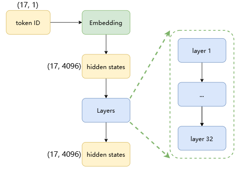 现在终于在第一层之后为每个 token 提供了新的 token embedding,之后的 31 层也是一样的处理过程: