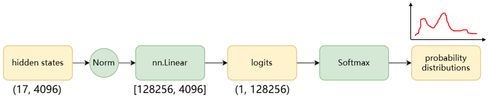 模型中最后一个线性层的输出称为 logits,表示未缩放的“概率”,但总和不为1,因此需要 Softmax。只有最后一个 token embedding 用于预测